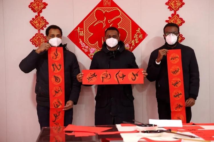 在西呂村新時代文明實踐站,我們看到書法老師們揮毫潑墨、運筆如飛,一幅幅充滿祝福的文字躍然紙上。來自蘇丹的三位國際友人,和大家一起認(rèn)真了解“?!弊趾蛯β?lián)的歷史淵源,邊聽邊學(xué),邊看邊練,在老師的指導(dǎo)下也慢慢嘗試書寫著中國“福”字,不禁對博大精深的中國文化連連稱贊。蘇丹友人還專門用阿拉伯語寫上了獨具特色的迎新對聯(lián),送上了濃濃的節(jié)日祝福,現(xiàn)場一片熱烈喜慶,祥和歡樂。