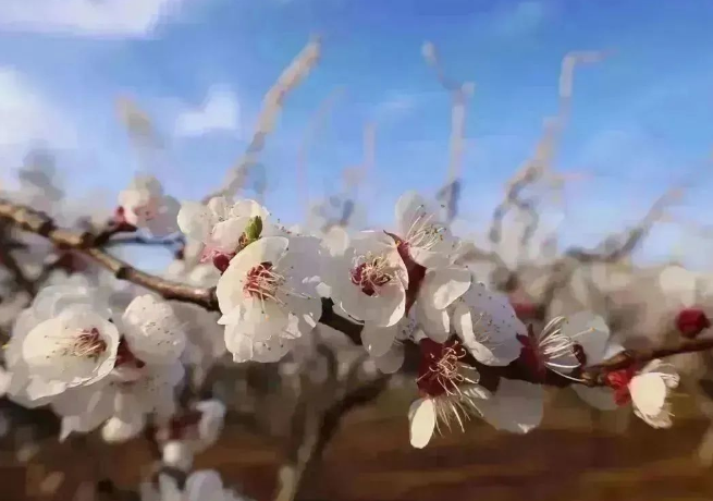 寫春日陽光里杏花綴滿了樹梢,