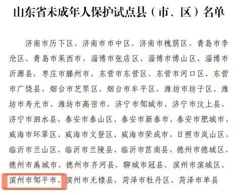 近日,山東省民政廳下發(fā)《關于公布山東省未成年人保護試點縣(市、區(qū))名單的通知》,公布省未成年人保護試點縣(市、區(qū))名單,鄒平市榜上有名。