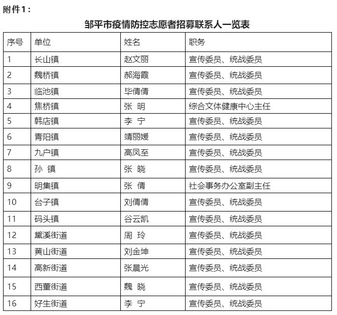 附件1:鄒平市疫情防控志愿者招募聯(lián)系人一覽表